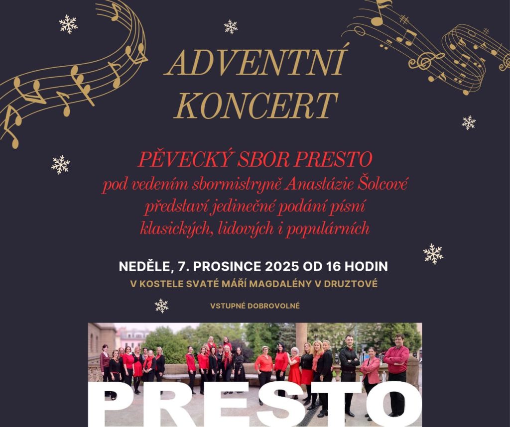 Koncert Presta v kostele Druztová Kostel svaté Maří Magdalény Druztová Koncert se uskuteční dne 7. prosince 2025 od 16:00. Vstupné volné.